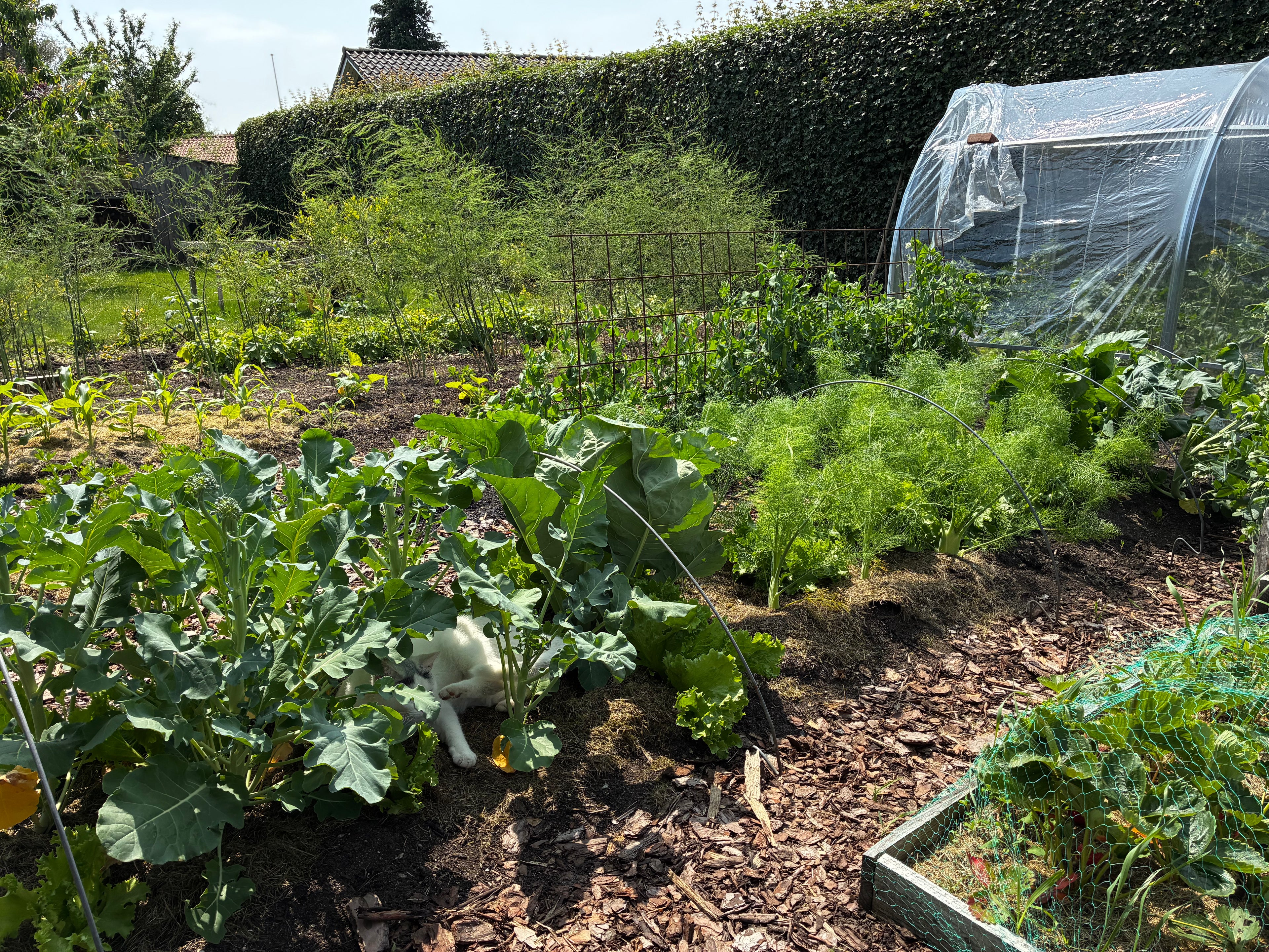 I tidens løb er køkkenhaven vokset, og i 2025 etablerede jeg en højbedshave og rejste en drivtunnel. Det er blandt andet her, jeg dyrker tomaterne, jeg tager frø fra og sælger her på siden. Da jeg var barn, var tomater røde og havde to størrelser: lille og mellemstor. De fleste butikker sælger stadig kun røde tomater, men hvis du er villig til at dyrke dine tomater fra frø, kan du få grønne, stribede, orange, hvide og lilla tomater i allemulige former. Faktisk er det kun fantasien, som sætter grænsen, for tomaternes verden er vidunderligt stor og mangfoldig. Og når du først har sat tænderne i en hjemmedyrket tomat, som har smukke marmoreringer, er vokset op på solskin og er fuld af saft og smag, kigger du dig ikke tilbage.